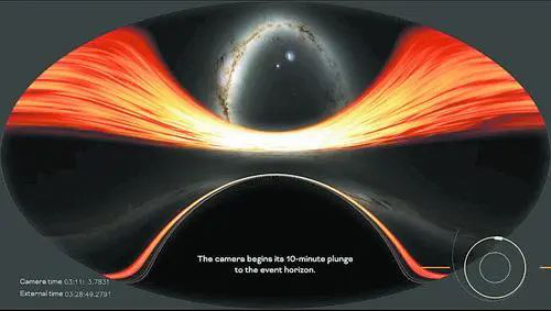 黑洞引力非常强大,以致于时空本身都会扭曲。NASA报告称,乘坐宇宙飞船绕黑洞运行6小时的人,会比母船上的其他乘员衰老36分钟。研究人员此次使用超级计算机创建了一个模拟旅程:它假设一名体验者冲入超大质量黑洞,这时观众可以代入自己就是这名体验者,在坠落过程中翻滚,经过围绕黑洞运行的幽灵般的光粒子跑道,最终到达一个无法返回的点——事件视界。在那里,任何物质,包括光,都无法逃脱。