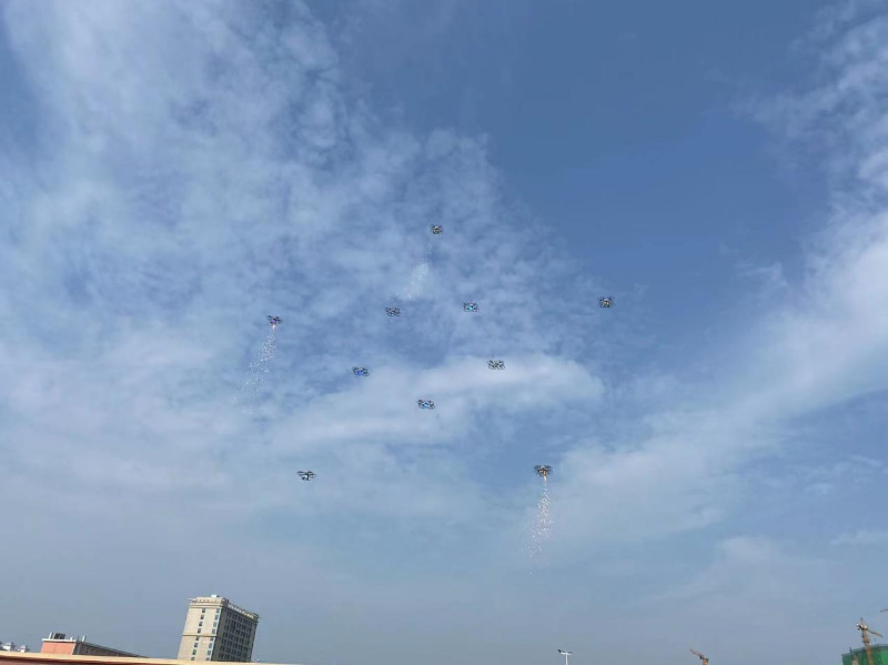 庄严的升国旗仪式拉开了此次活动的序幕。随后,10余架无人机列好阵型,不断变换着颜色、形状在空中进行无人机编队表演和操控特技表演,为师生们带来了一场视觉盛宴。