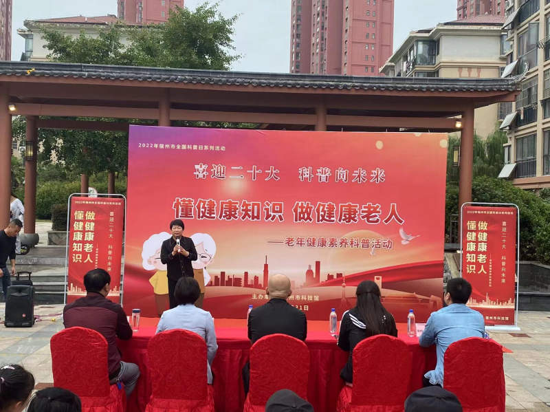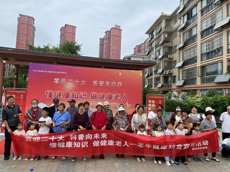 8月31日上午,由市科技馆主办的“喜迎二十大,科普向未来”2022年宿州市“懂健康知识 做健康老人”老年健康科普宣传活动在埇桥区三八街道杨庙社区龙登和城C区广场举行。