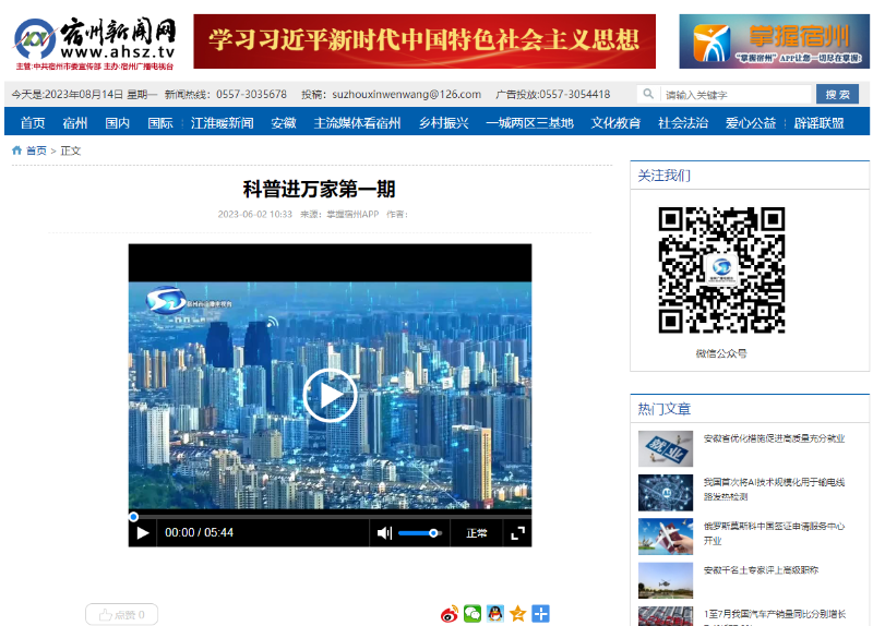 《科普进万家》电视栏目,由宿州市广播电视台电视新闻综合频道播放,播出时间从2023年6月起开播,一年为24期,每两周一期,每期3到5分钟以内,每期重播一周。