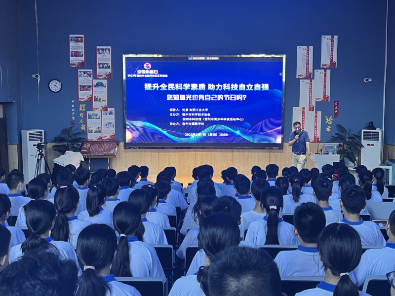 9月7日,由宿州市科协指导、宿州市科技馆主办的2023年宿州市“全国科普日”活动走进宿州市鲲鹏学校,邀请合工大刘晨教授作题为“您知道光也有自己的节日吗?”科普报告。200名师生现场聆听了此次报告。