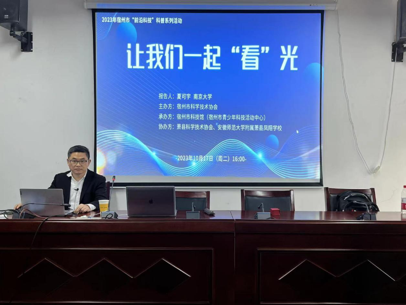 10月17日,由宿州市科协主办,宿州市科技馆承办的2023年宿州市“前沿科技”活动走进安师大附属萧县凤翔学校,邀请南京大学夏可宇教授作题为“让我们一起‘看’光”科普讲座。近百名师生现场聆听了此次讲座。