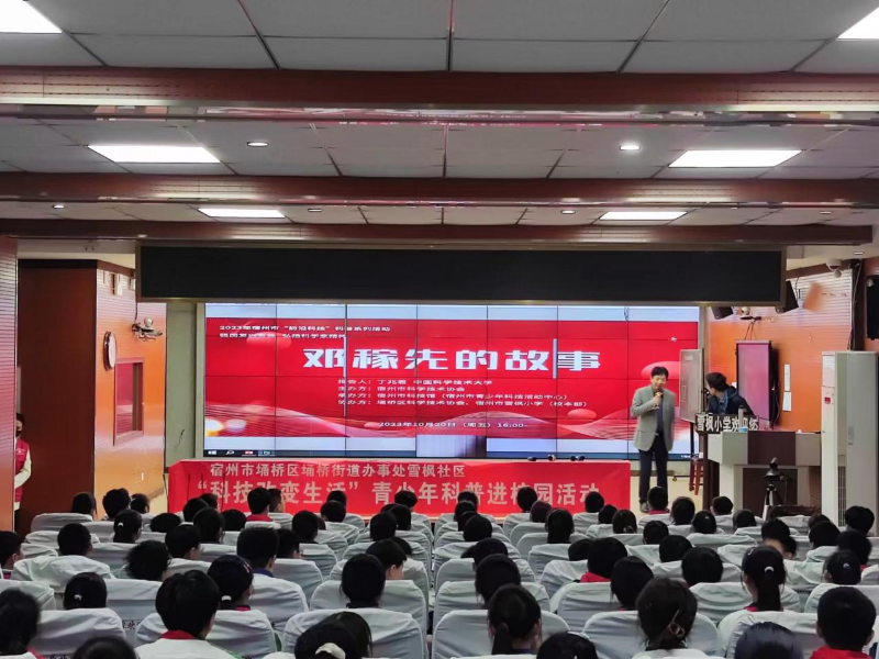 10月20日,由宿州市科协主办、宿州市科技馆承办的“强国复兴有我 弘扬科学家精神”科普活动走进宿州市雪枫小学,邀请中科大丁兆君教授作题为“邓稼先的故事”讲座。近百名师生现场聆听了此次讲座。