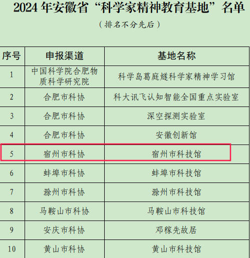 日前,2024年安徽省“科学家精神教育基地”名单发布,全省10家基地入选,宿州市科技馆名列其中。