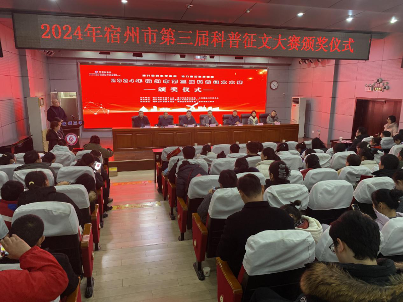 12月22日上午,2024年宿州市第三届科普征文大赛颁奖仪式在宿州第三中学举行。此次大赛由宿州市科学技术协会、宿州市教育体育局、共青团宿州市委员会联合主办,宿州市科技馆承办。大赛共评出一等奖2名,二等奖5名,三等奖10名,优秀奖141名,优秀指导老师30名。
