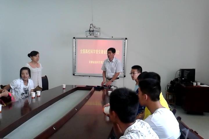 宿州二中今年有10位同学被选拔参加2014全国高校科学营北京师范大学分营活动。7月19日,宿州二中按照全国高校科学营活动要求,进行了营前培训。市科协调研员赵民强、市科协科普部部长王莉,以及被选拔参加全国高校科学营的10位学生及部分家长参加了营前培训会。培训会由二中校办室主任吴立清主持。市科协领导介绍了全国高校科学营的由来、学生的选拔规则,并对参营学生提出了明确要求。按照全国高校科学营文件要求,每位参营学生要有一段简短的发言及视频录像,上传到全国高校科学营办公室。培训会上,我校10位学生分别发言,简短的发言彰显了青春朝气及我校学生的风采。