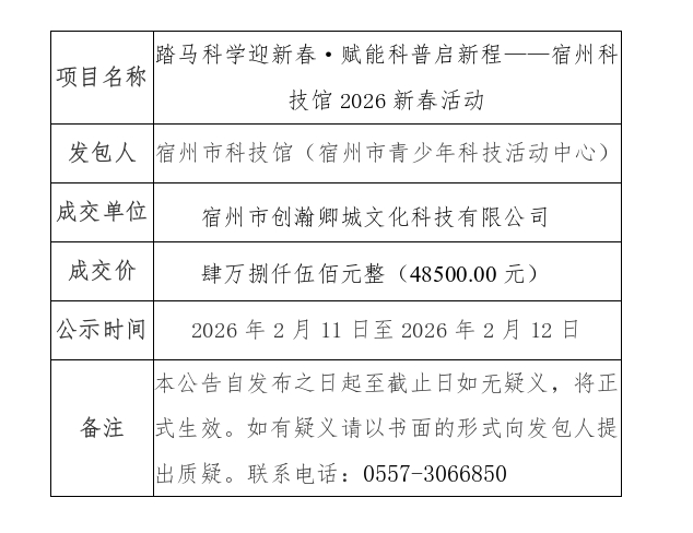 踏马科学迎新春·赋能科普启新程——宿州科技馆2026新春活动成交公示