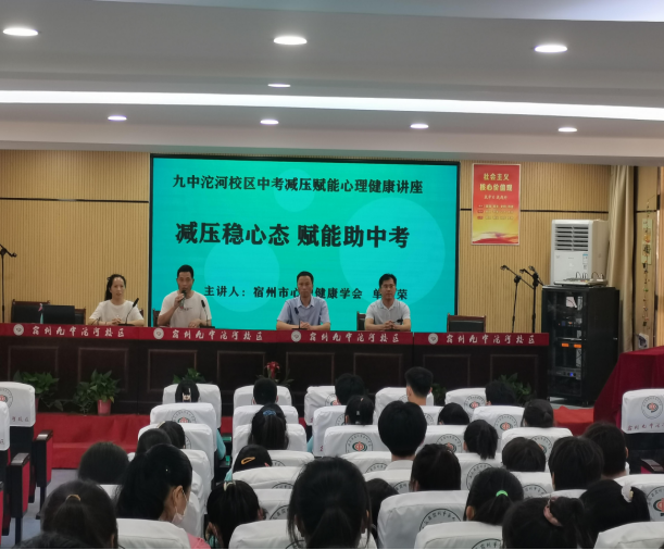 2022年6月2日,宿州市心理健康学会心理健康服务应邀走进宿州九中沱河校区,为九年级所有学生上了一场生动的心理讲座,题目为《减压稳心态 赋能助中考》。